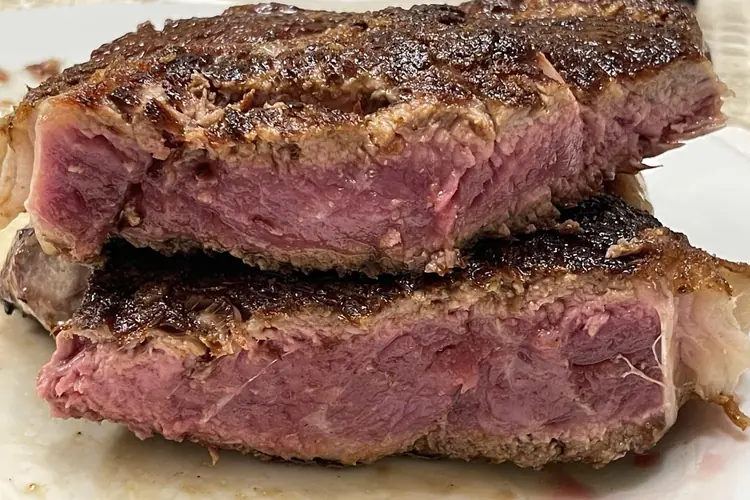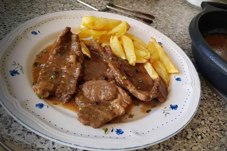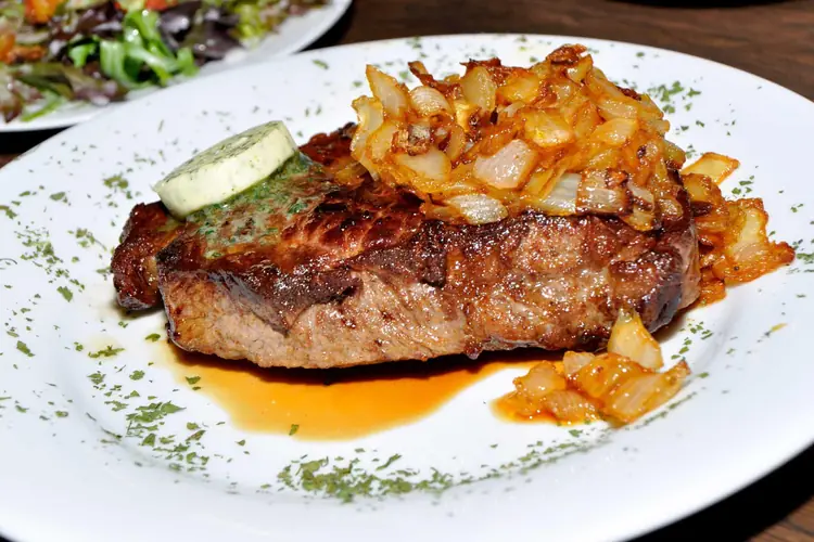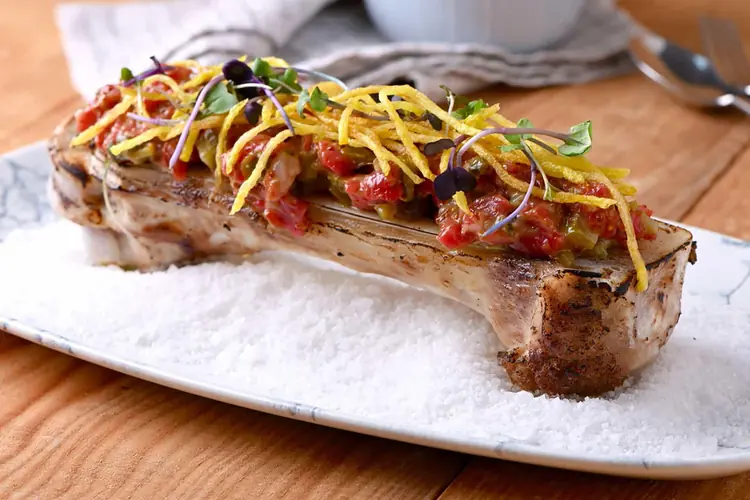 Chuletón de buey Ingredientes para dos personas: 1 chuletón de 1, 200 kg; sal gorda. Preparación: el chuletón ha de ser de res adulta y ha de encontrarse veteado y maduro (mínimo: veinte días en frigorífico a 3 °C. Se coloca sobre la brasa unos ocho minutos y se le da la vuelta. Cuando adquiera una corteza que le impida perder su jugo, se retira del fuego. Se corta en trozos de unos cuatro centímetros que se sirven sobre plato refractario suficientemente caliente.