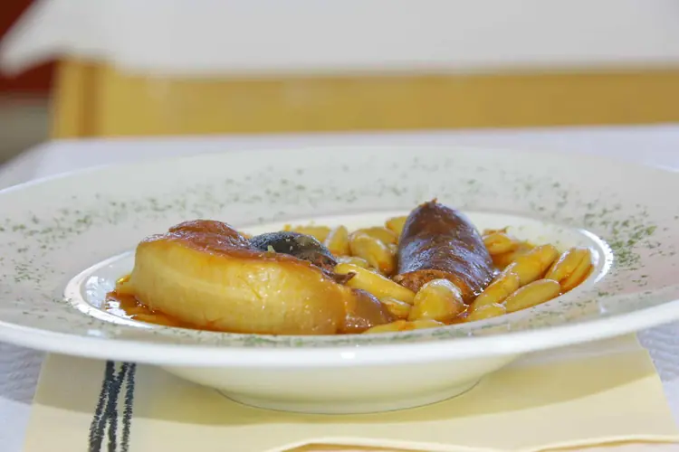 Fabada A la fabada le cabe el honor de ser el primum inter pares de los platos más representativos de la cocina asturiana. Muchos son los restaurantes del Principado que pregonan como máxima especialidad su fabada, y todos ellos, por su buen hacer, han contribuido al éxito de este plato. Gracias a su colaboración ha sido posible la redacción de esta fórmula: Ingredientes para 6 personas: 800 g de fabes de la granja; 2-3 morcillas; 2-3 chorizos; 500 g de lacón; 100-150 g de tocino entreverado; aceite, sal, azafrán. (Opcionalmente, hay quienes aconsejan también ajo, cebolla y un poco de laurel. En sentido estricto, estos complementos no son