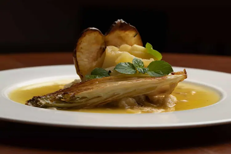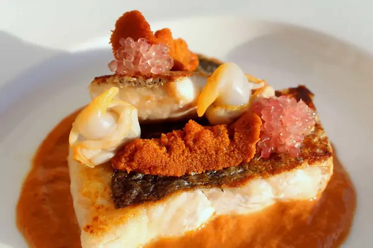 Pastel de buey de mar con salsa de pimientos amarillos