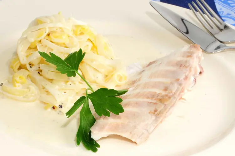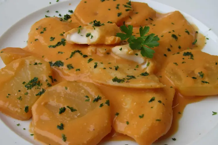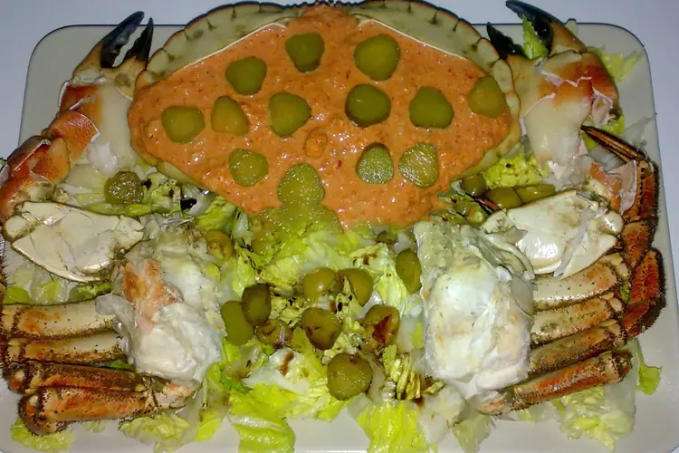 Pastel de buey de mar con salsa de pimientos amarillos Ingredientes: para el pastel: 1 kg de carne de buey de mar (noca) cocido sin sal; 0, 450 litros de nata líquida; 4 huevos batidos; sal. Para la salsa: 2 pimientos amarillos; 2 cucharadas soperas de cebolla bien picada; 1 diente de ajo; 1 guindilla. Preparación: cuece el marisco sin sal (detalle que ha de tenerse muy en cuenta), se escoge muy bien la carne y se tritura perfectamente; después se mezcla con el resto de los ingredientes citados hasta conseguir una mezcla homogénea. En un molde engrasado con mantequilla se vierte esa mezcla y cuaja al baño María en horno a 180 °C durante una